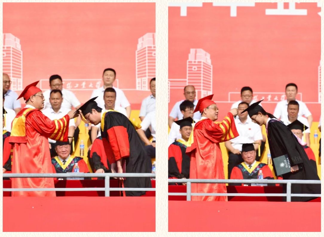 贾玉明为毕业生代表正冠拨穗、授予学位证书并深情寄语。他向圆满完成学业的2024届毕业生表示热烈祝贺,向潜心育人的老师们和默默付出的家长们致以崇高敬意。
